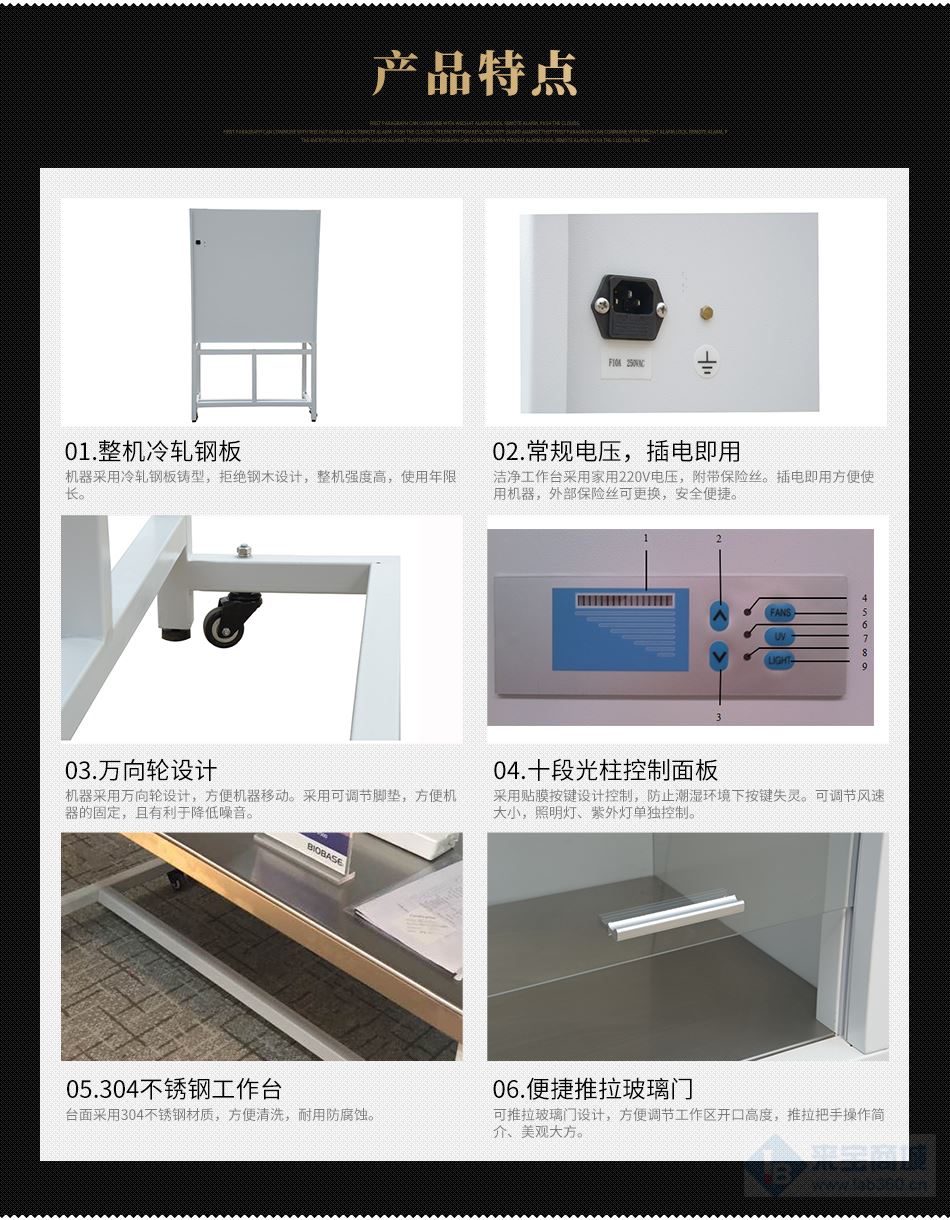 1.11 底腳頂絲、潔凈臺(tái)萬(wàn)向輪的設(shè)計(jì),潔凈臺(tái)可通過(guò)萬(wàn)向輪移動(dòng)且可以通過(guò)調(diào)節(jié)底腳頂絲固定調(diào)平。
