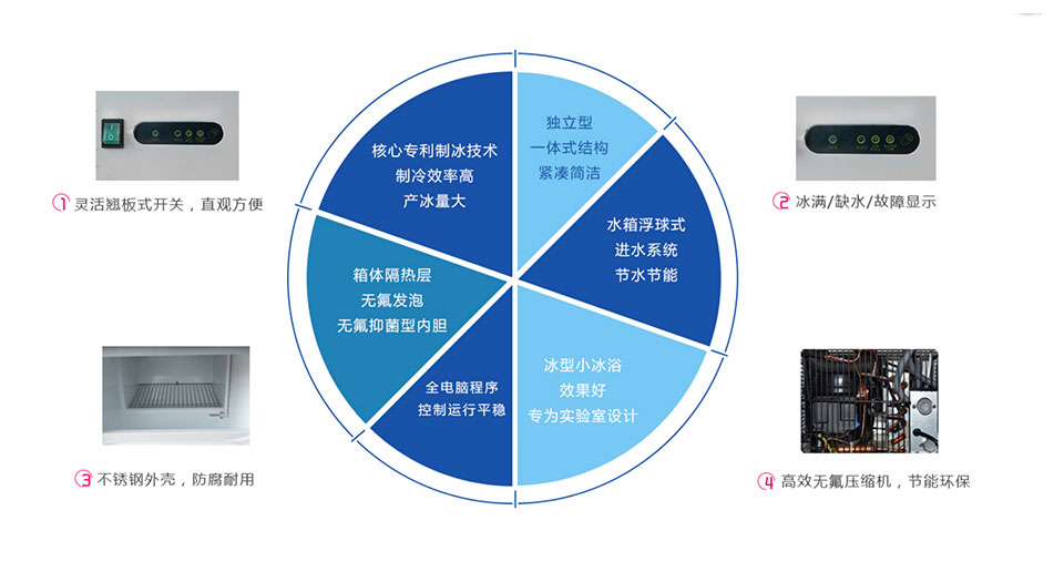 10)所制冰形為不定形的細小顆粒狀雪花碎冰,冰形小,能滲入較窄間隙,冷卻速度快,冰浴好,為實驗室設計。