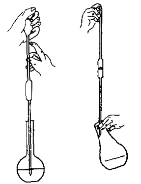 再用水連續(xù)振蕩數(shù)次,必要時用蒸餾水淋洗三次。洗凈狀態(tài)下,水均勻分布不掛水珠(如左圖所示);未洗凈狀態(tài)下,器壁掛著水珠(如右圖所示)。