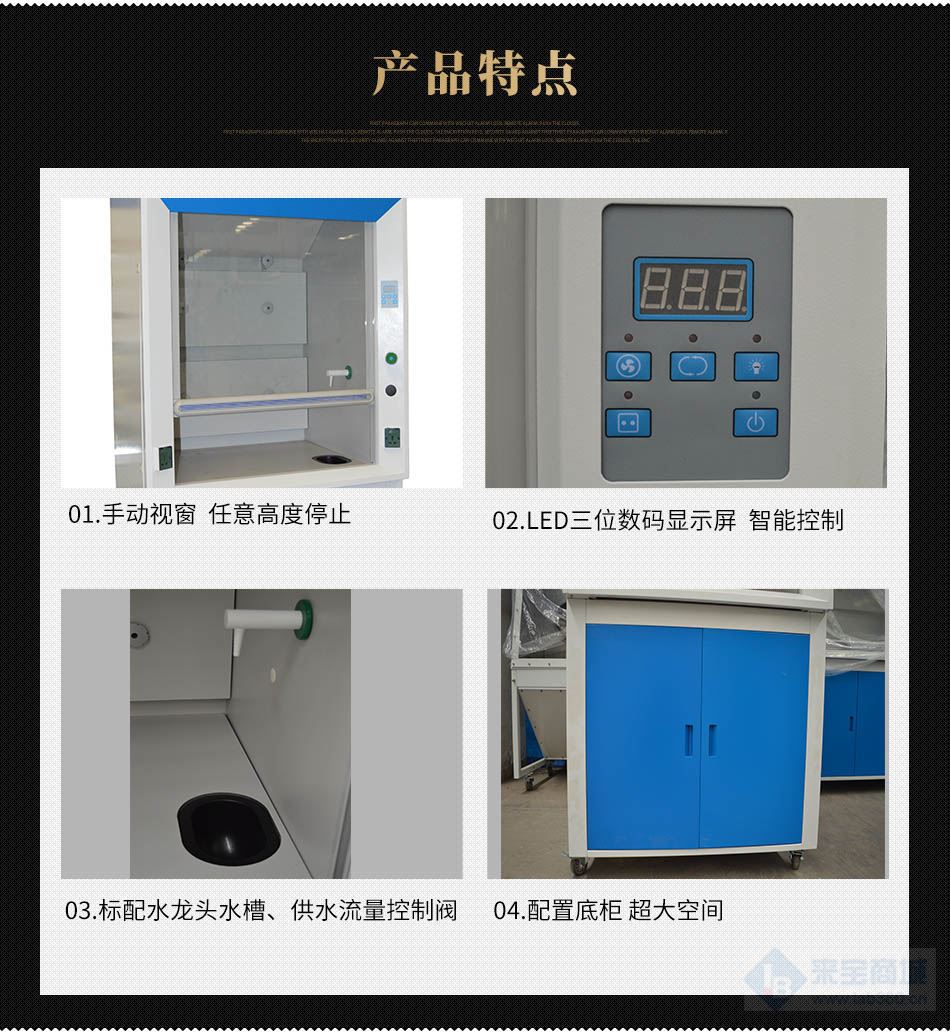 * 8、通風(fēng)柜配置底柜,底柜采用1.0mm冷軋鋼板經(jīng)防銹處理,靜電噴涂,具有較好的光潔度與耐腐蝕性;底柜1060*480*635mm(L×D×H)的超大空間可以放置實(shí)驗(yàn)室用品;底柜與上柜體配套使通風(fēng)柜更加美觀實(shí)用。