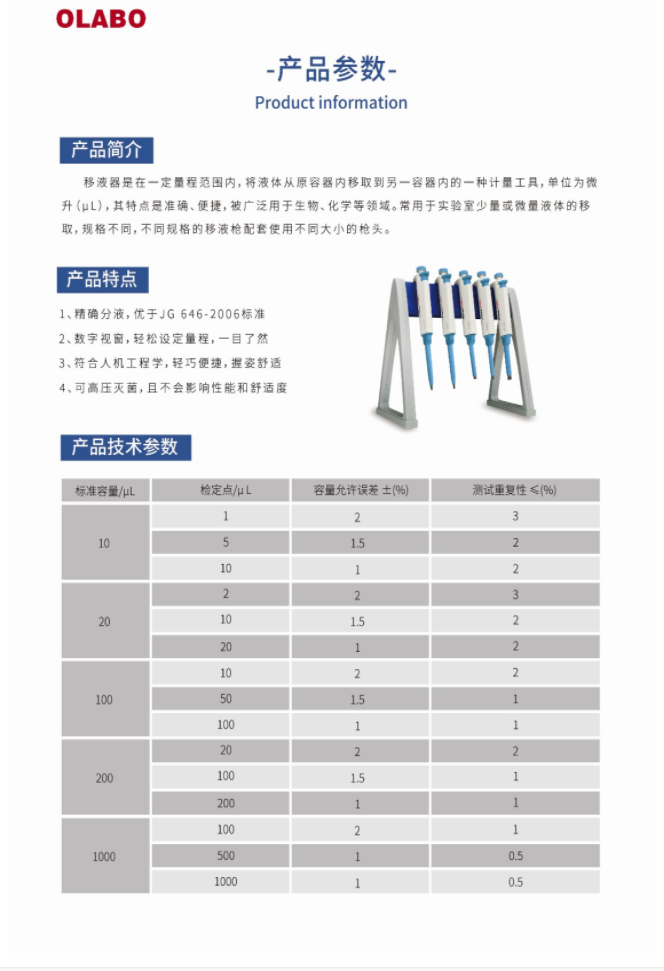 國產(chǎn)OLABO,B系列單道可調(diào)式移液器10-100μl