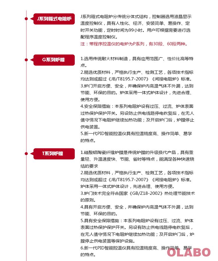 1、T系列爐膛---硅酸鋁陶瓷纖維爐膛是傳統(tǒng)爐膛的升級換代產(chǎn)品,具有重量輕、升溫速度快、節(jié)能、省時(shí)等特點(diǎn),能滿足各種快速燒結(jié)的要求. 2、精選優(yōu)質(zhì)材料,嚴(yán)格執(zhí)行生產(chǎn)、檢測工藝4、爐門結(jié)構(gòu)采用全方位密封技術(shù)。具有開啟方便、安全,并確保爐內(nèi)高溫氣體不外漏,達(dá)到節(jié)能、環(huán)保的目的。 3、具有安全保障措施:本系列電阻爐設(shè)有過壓、過流、爐體表面過熱保護(hù)保護(hù)開關(guān)。另設(shè)有防止供電線路停電恢復(fù)后,在無人值守情況下電阻爐繼續(xù)加熱功能;及開啟爐門后,爐膛停止供電裝置等保護(hù)設(shè)施。 4、新一代PID智能控溫儀具有控溫精度高、操作簡單、易學(xué)的特點(diǎn)。